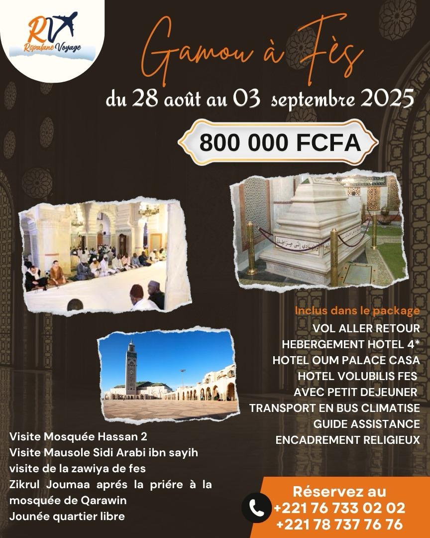 Découvrez le vibrant Gamou au Maroc avec le forfait Gamou à Fès. Ce forfait comprend le vol aller-retour, l’hébergement en hôtel 4 étoiles avec petit-déjeuner à Fès et Casablanca, le transport en bus climatisé et l’accompagnement religieux. Parmi les points forts, citons les visites guidées de la mosquée Hassan II, du mausolée de Sidi Arabi ibn Sayih et de la zaouïa historique de Fès.