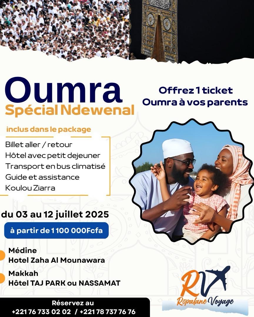 Embarquez pour un voyage spirituel intense avec le forfait Oumra Spécial Ndewenal. Plongez dans l’atmosphère sacrée des villes saintes de Médine et de La Mecque en Arabie saoudite. Ce forfait comprend le billet aller-retour, l’hébergement avec petit-déjeuner dans des hôtels haut de gamme, le transport en bus climatisé et une assistance guidée complète, incluant la visite de sites religieux majeurs (Koulou Ziarra). C’est l’occasion idéale d’accomplir le petit pèlerinage ou d’offrir ce cadeau précieux à vos parents.